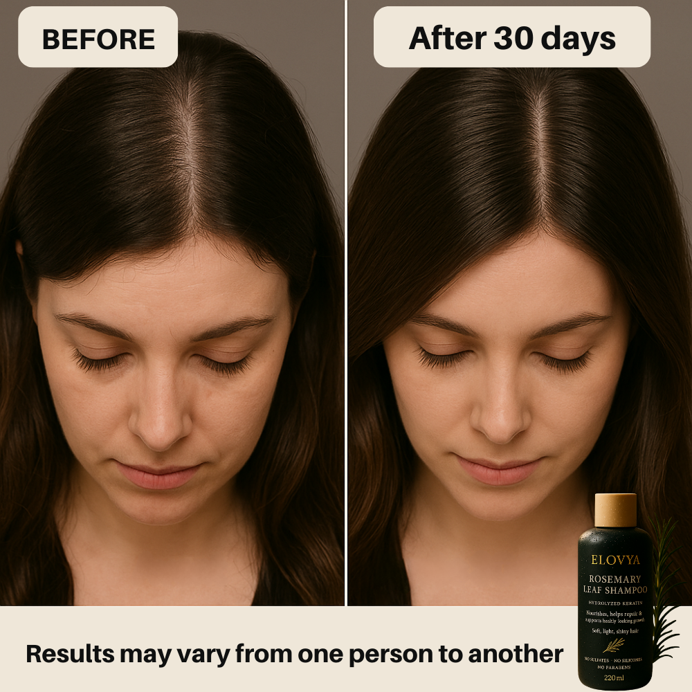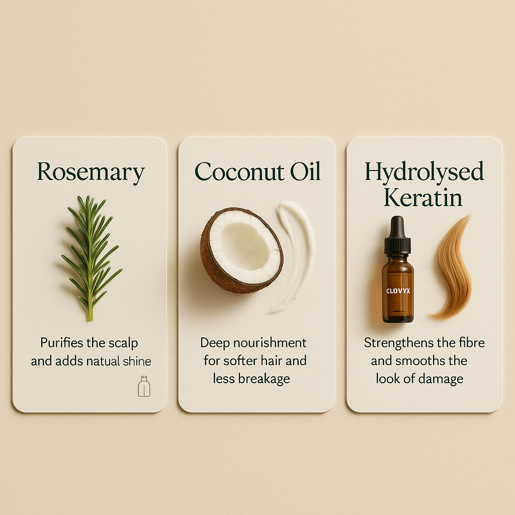 ELOVYA gently cleanses, balances the scalp and strengthens the hair fibre. Rosemary helps keep the roots fresh, coconut oil nourishes and softens, and hydrolysed keratin fills and smooths damaged areas. The result: less breakage, greater softness and shine, and visibly fuller hair over time.